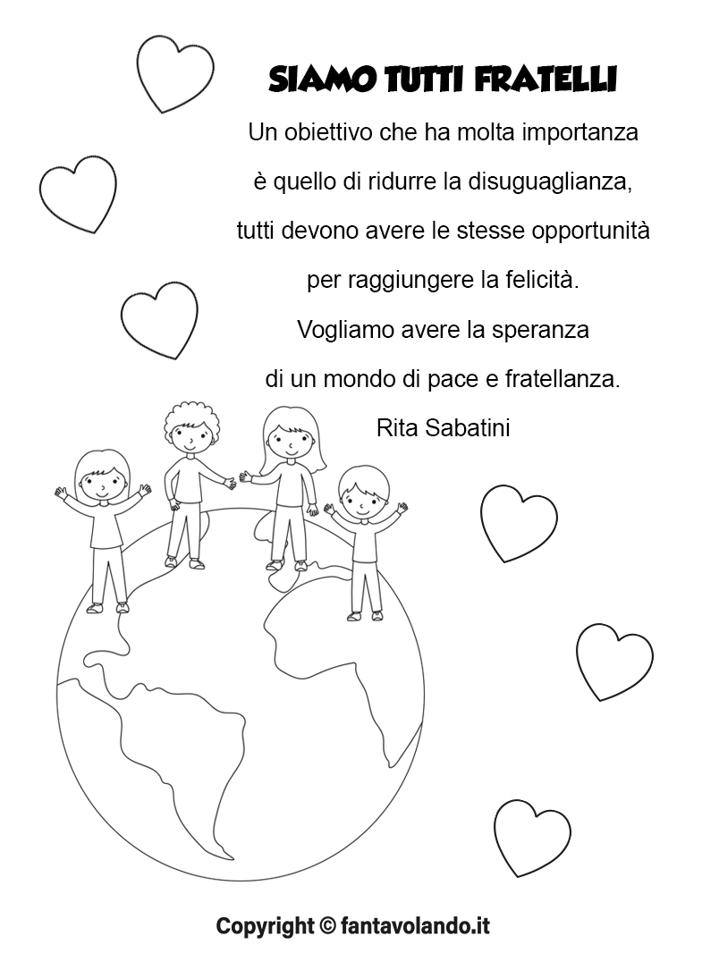 Invitiamo i bambini a riflettere sull’obiettivo 10 dell’Agenda 2030: ridurre le disuguaglianze. Prendendo spunto dalla poesia Siamo tutti fratelli di Rita Sabatini (tutti i diritti riservati) chiediamo: