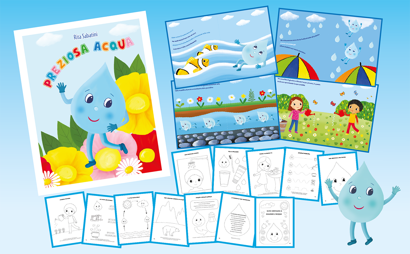 L’albo illustrato Preziosa acqua di Rita Sabatini (tutti i diritti riservati) è finalizzato a favorire la riflessione sull’importanza di salvaguardare l’acqua adottando comportamenti responsabili fin dall’infanzia. Nel testo le bambine e i bambini potranno scoprire l’importanza dell’acqua, conosceranno il ciclo dell’acqua e impareranno quali sono i comportamenti corretti per non sprecarla. Nel libro, oltre alla storia, è disponibile anche un percorso di percorso di educazione civica e alla sostenibilità con le schede didattiche per favorire la conoscenza dell’acqua.