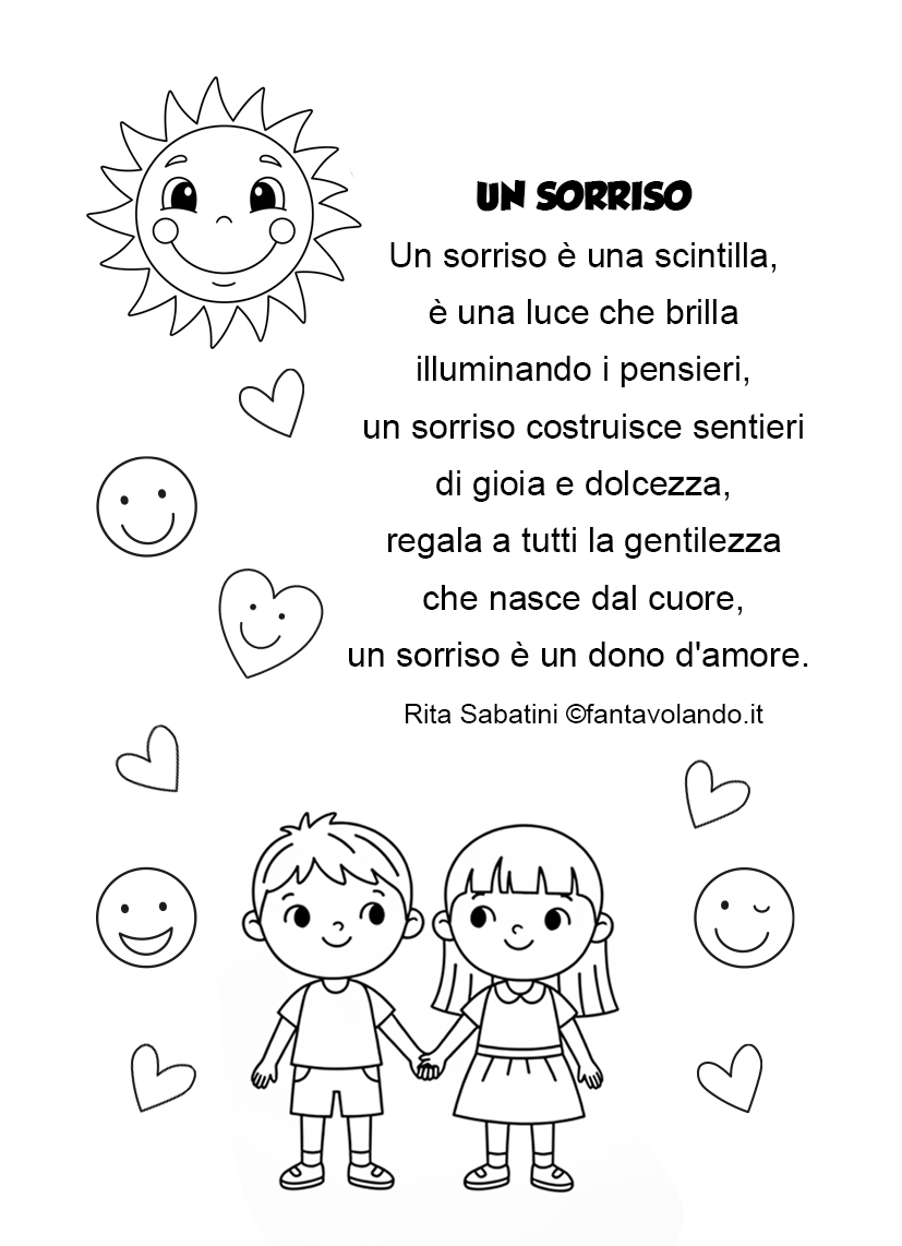 Suggerimenti: Nel post Emozioni: schede didattiche, poesie, storie, attività è disponibile l’indice delle attività relative alle emozioni. Iscrivetevi al canale YouTube di Fantavolando e cliccate sulla campanella così vi arriverà la notifica di tutte le novità inserite. Seguite Fantavolando.it anche su Facebook, Pinterest e Instagram per essere sempre aggiornati sulle novità! Le schede, le storie, le poesie, i video, le attività e tutti i materiali di Fantavolando.it sono protetti dalla legge sul diritto d’autore. I materiali si possono utilizzare in classe per i bambini lasciando tutti i riferimenti agli autori e al sito ma non possono essere modificati/rielaborati, né inseriti in altri siti, blog, social, gruppi Facebook, piattaforme per la DAD, gruppi social, canale YouTube, ecc. e non possono essere utilizzati per concorsi, testi, spettacoli, canzoni, pubblicità, laboratori organizzati da enti/privati/associazioni/pedagogisti/psicologi o altri professionisti in genere, ecc. come indicato nelle condizioni d’uso. |