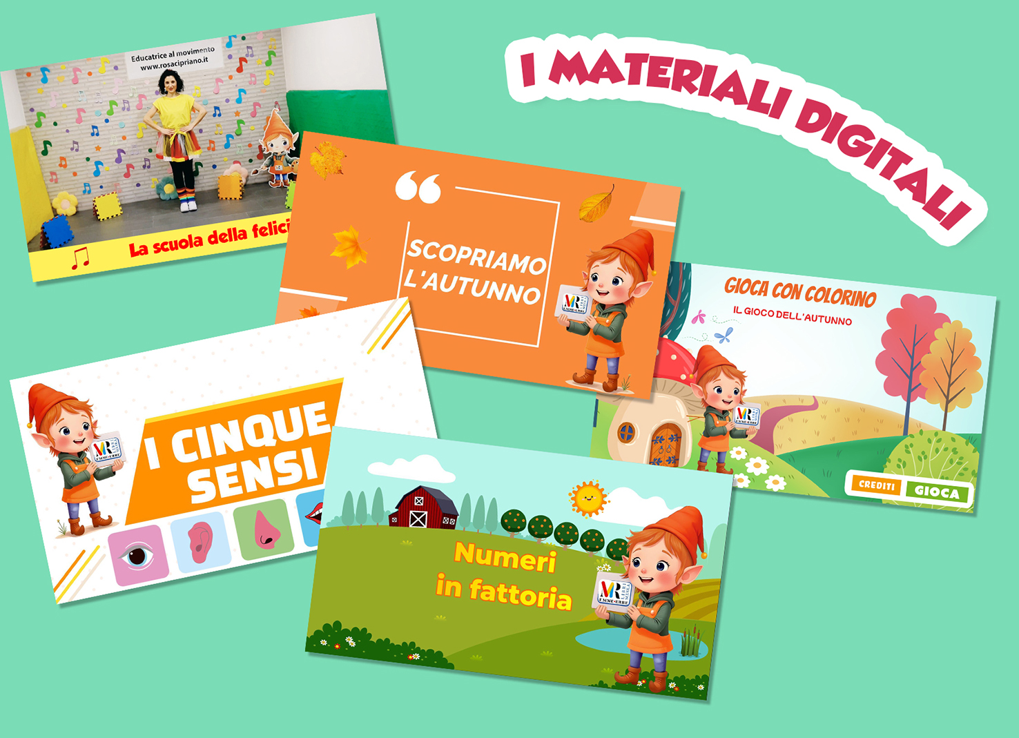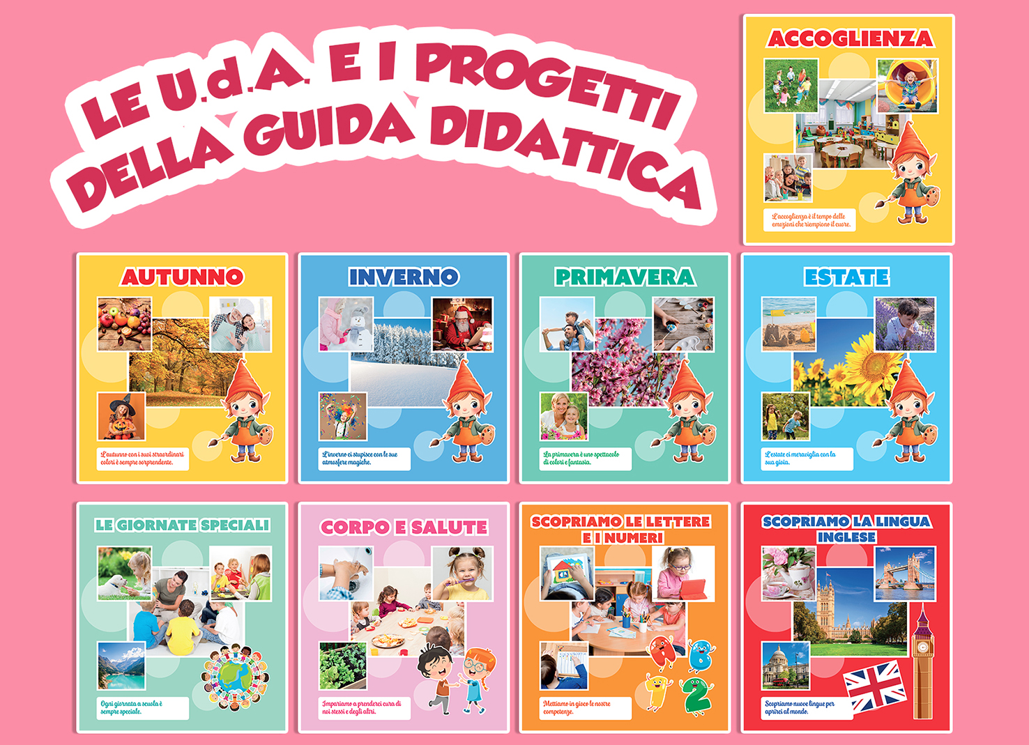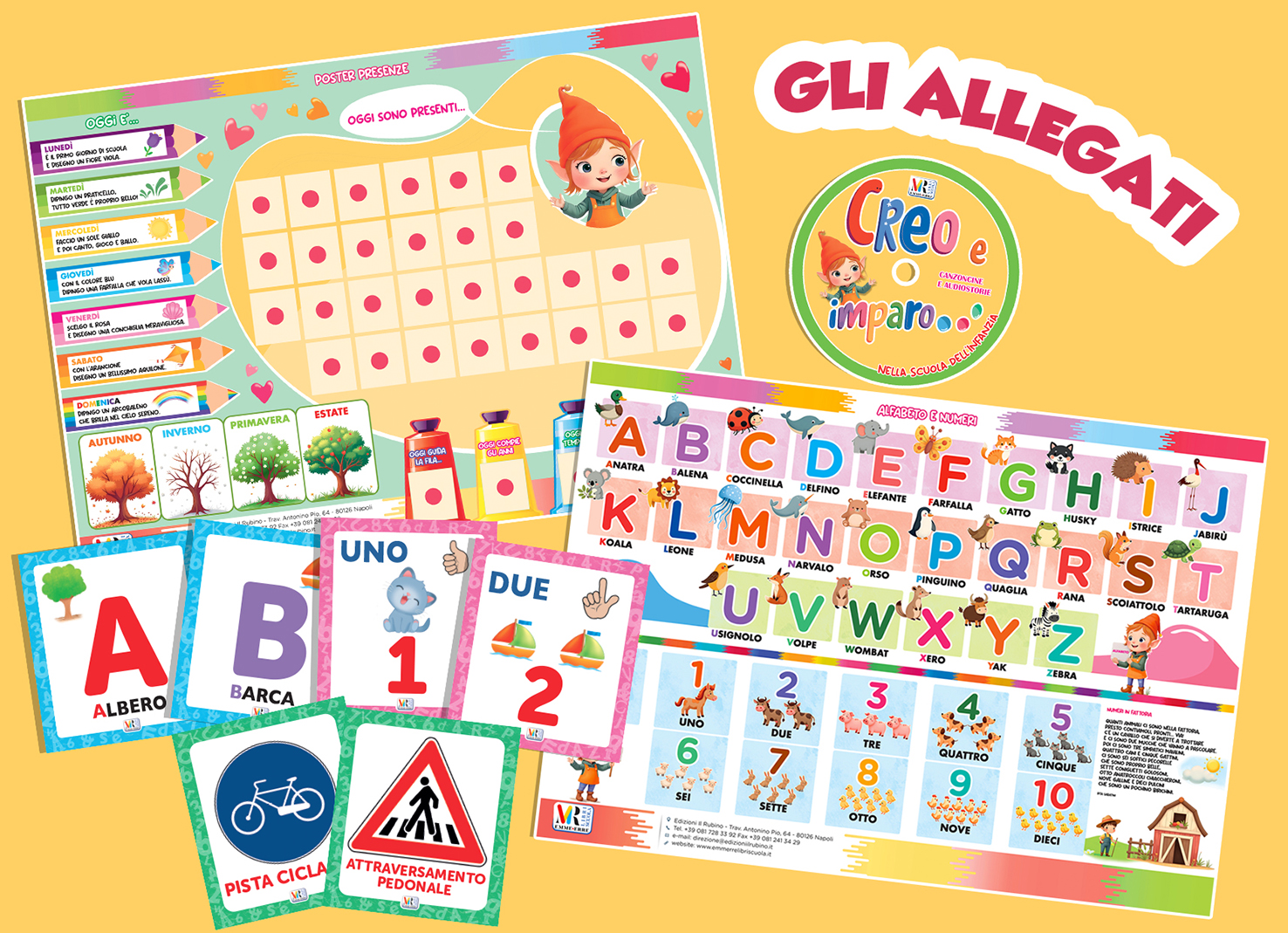 | In omaggio alla Guida didattica vengono forniti: il cd con le canzoncine e le audiostorie, il poster delle presenze, il poster dell’alfabeto e dei numeri, le tavole illustrate con l’alfabeto, i numeri e i segnali stradali, il calendario scolastico murale. |