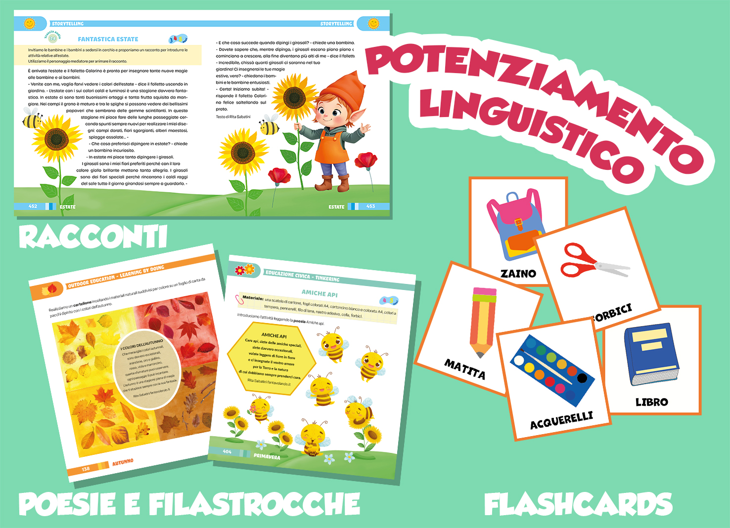 Per favorire lo sviluppo delle competenze linguistiche vengono proposti racconti, poesie, filastrocche, canzoncine e oltre 100 flashcards per arricchire il lessico. |