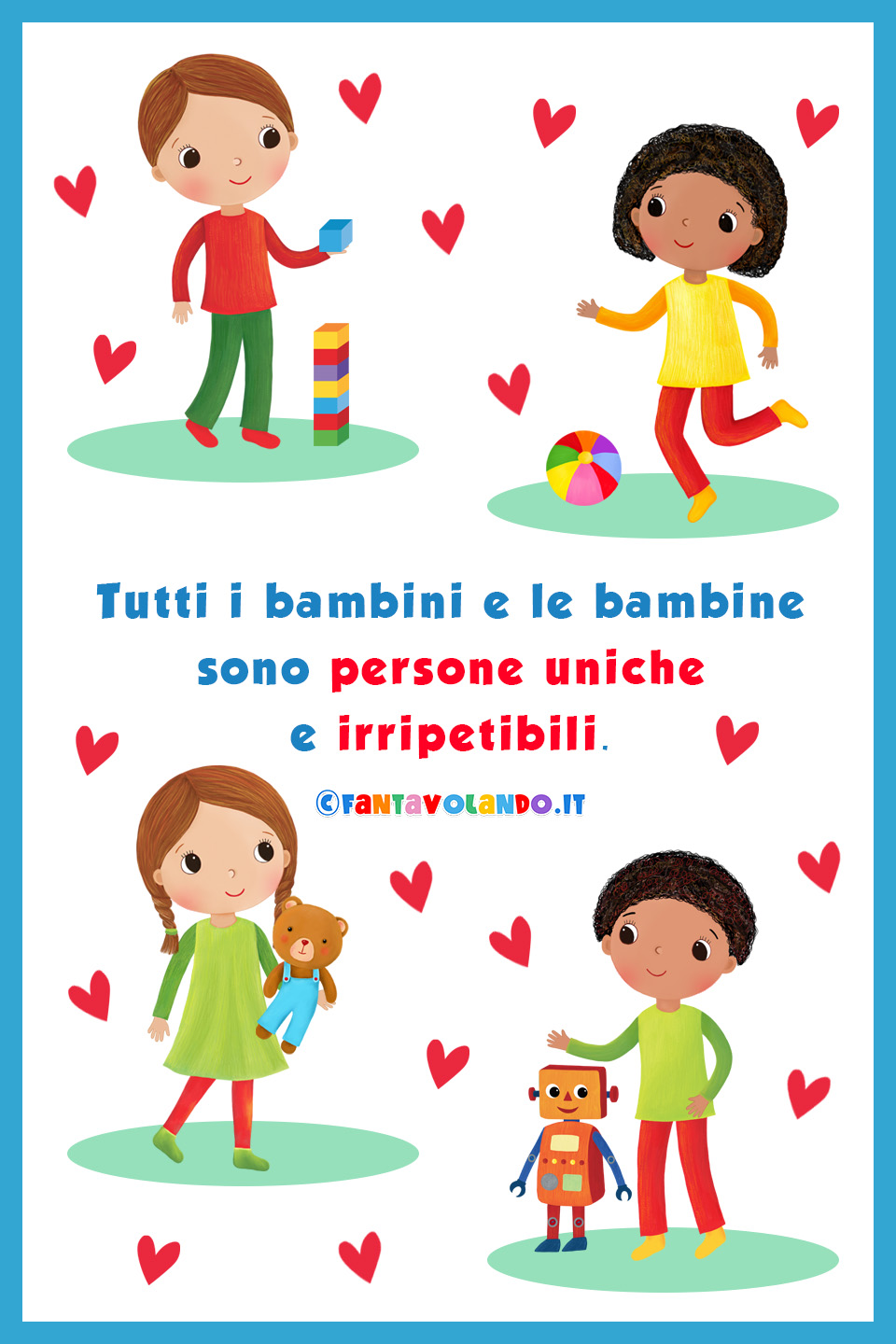 Suggerimenti Potete trovare l’indice delle attività per l’accoglienza disponibili nel sito di Fantavolando nel post Accoglienza: festoni, regali, attività per bambini, lavoretti, schede, regole, routine, coccarde, bandierine Iscrivetevi al canale YouTube di Fantavolando.it e cliccate sulla campanella così vi arriverà la notifica di tutte le novità inserite. Seguite Fantavolando.it anche su Facebook, Pinterest e Instagram per essere sempre aggiornati sulle novità! Le schede, le storie, le poesie, i video, le attività e tutti i materiali di Fantavolando.it sono protetti dalla legge sul diritto d’autore. I materiali possono essere utilizzati dai docenti nella propria sezione/classe lasciando tutti i riferimenti all’autrice e al sito ma non possono essere modificati/rielaborati, né inseriti in altri siti, blog, social, gruppi Facebook, piattaforme per la DAD, gruppi social, canale YouTube, ecc. e non possono essere utilizzati per concorsi, testi, spettacoli, canzoni, pubblicità, laboratori organizzati da enti/privati/associazioni/pedagogisti/psicologi o altri professionisti in genere, ecc. inoltre non possono essere utilizzati per addestrare l’IA come indicato nelle condizioni d’uso. |