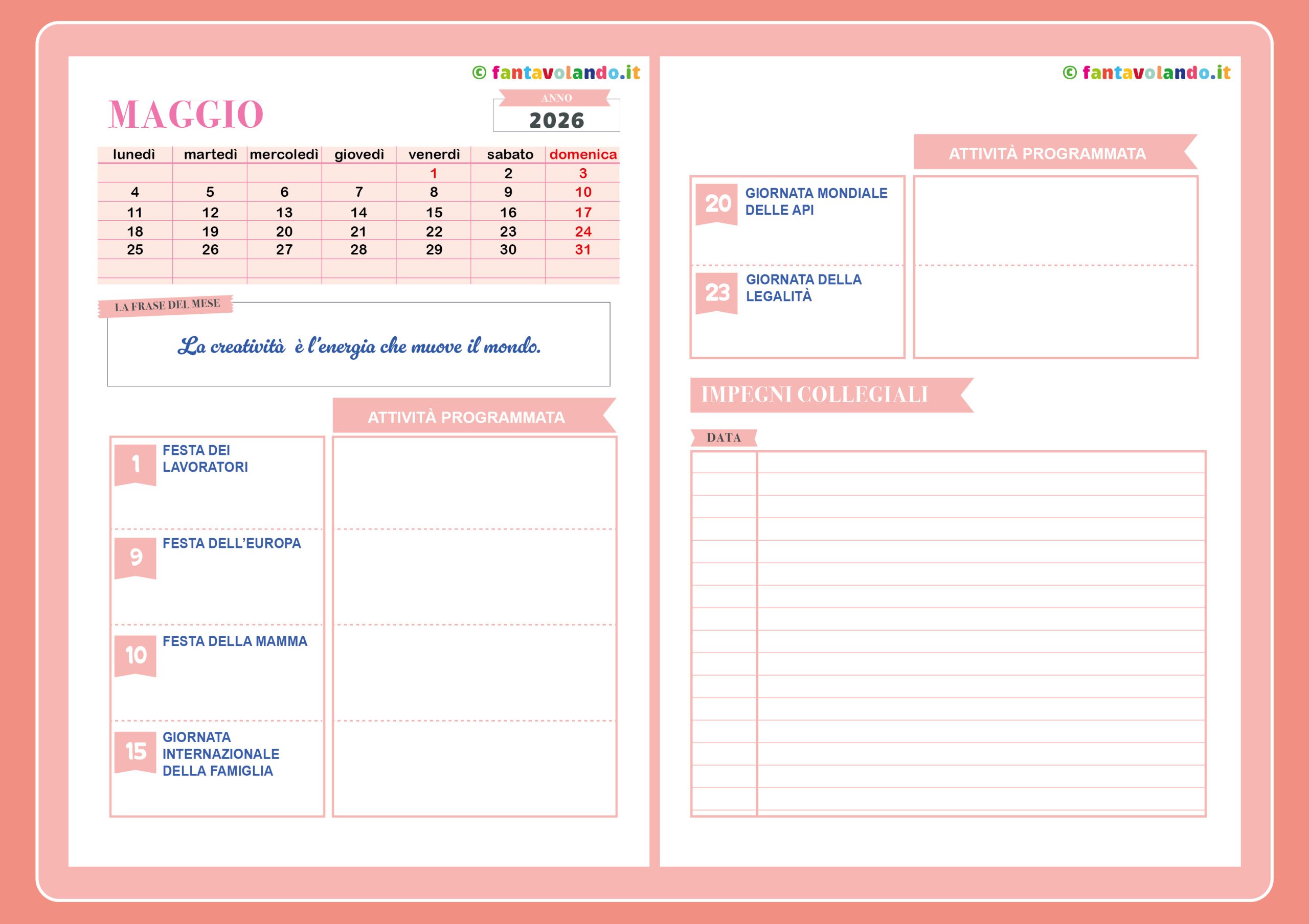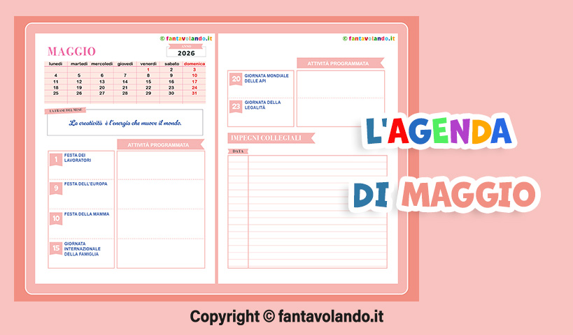 Per organizzare il lavoro a scuola è utile avere a disposizione una pagina di agenda dove annotare le attività da realizzare per le giornata speciali e per le feste, le riunioni, gli aggiornamenti, ecc. La pagina dell’agenda di Fantavolando.it viene aggiornata ogni mese, si può stampare gratuitamente ed è utile per ricordare le principali feste e giornate speciali e per scrivere gli impegni collegiali. In questo post potete trovare l’agenda di maggio da stampare e l’indice delle attività disponibili per ogni festa e giornata da ricordare relativa al mese di maggio. Le giornate speciali e le feste di maggio per cui potete trovare le attività sono: