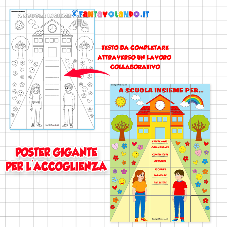 Durante l’accoglienza possiamo realizzare un poster gigante per favorire la capacità dei bambini di collaborare. Il poster gigante realizzato dai bambini e dalle bambine potrà essere utilizzato per decorare la classe o l’ingresso.
